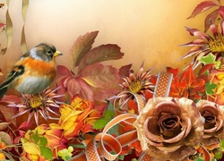 Puzzle: Kwiaty, Liście, Ptaszek, Jesienna, Kompozycja