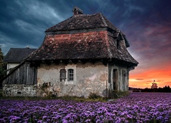 Puzzle: Stary, Murowany, Dom, Zachód Słońca, Fioletowe, Kwiaty