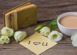 Puzzle: Kompozycja, Kwiaty, Eustoma, Pamiętnik, Kawa, Kartka, Miłość
