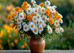 Kolorowe, Kwiaty, Bukiet, Drewniana, Ławka, AIBukiet, Kolorowe, Kwiaty, Płatki, PłótnoRóżowe, Fioletowe, Dalie, Grafika AIWiklinowy, Koszyk, Narcyzy żonkile, StokrotkiKwiaty, Żółte, Narcyzy żonkile, Zbliżenie