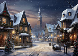 Puzzle: Zima, Ulica, Domy, Śnieg, Dekoracja, Noc, Światła, Choinka, Niebo