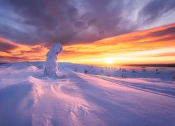 Puzzle: Zima, Śnieg, Drzewo, Chmury, Zachód słońca